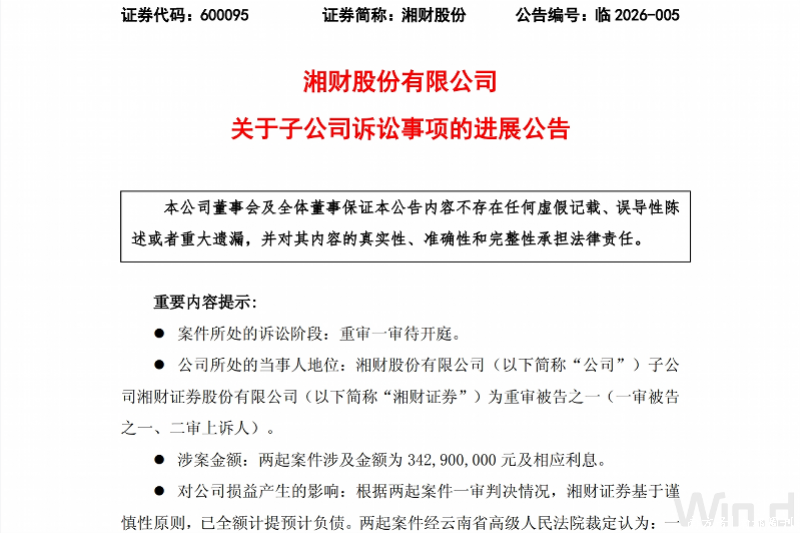 根据公告,湘财证券称,公司子公司湘财证券近日收到昆明中院送达的两起案件重审一审的应诉通知书、举证通知书等相关材料。